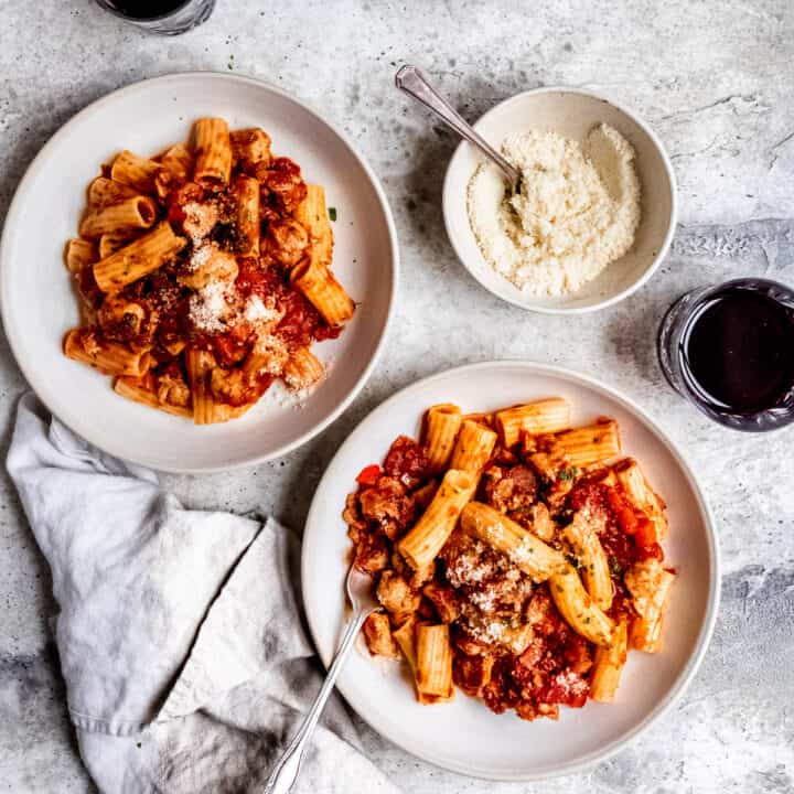A sausage traybake that is full of flavourful roasted veggies and the most perfect silky pan sauce. An all-in-one dinner that everyone will love!